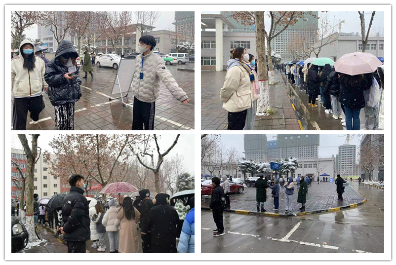 12月25日,全员核酸检测现场,天空突降大雪,气温骤降。医护人员坚守在“疫”线,不停歇地为全校万人做核酸检测,哪怕双手冰凉、双脚麻木,他们仍然坚守岗位。“军魂社”的退伍军人以标准的军姿在风雪中屹立,坚持“两步一桩”的疫情防控要求,有序地维护核酸检测现场秩序。面对风霜雨雪,老师与学生们相伴,在核酸检测现场,和全体学生一同抗疫。
