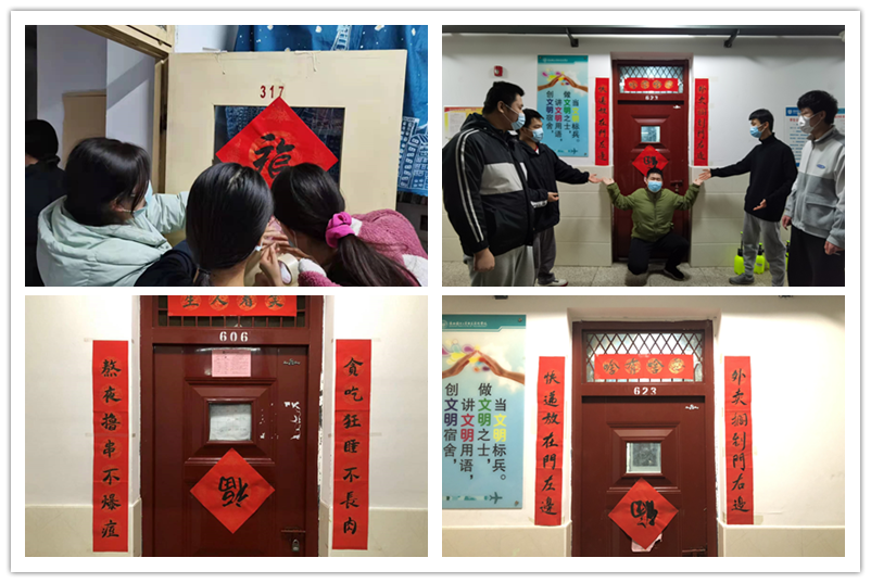 学生们收到“福”和对联后,纷纷取出工具,往门上贴“福”,门框上贴对联。有的同学急切地撕开胶布,有的在门口比划位置,有的喊道“歪了”,有的说“福”应该倒过来贴,“福到了”。有的宿舍张贴出对联:上联“快递放在门左边”,下联“外卖搁到门右边”,横批“要啥有啥”;有的宿舍的对联反映了学生对生活的“憧憬”,上联“熬夜撸串不爆痘”,下联“贪吃狂睡不长肉”,横批“笑看人生”。红色的“福”字和对联,给在宿舍的同学增添了兴旺欢乐的喜庆气氛。