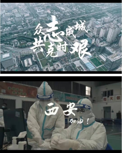 《微电影拍摄》课程团队教师结合各个历史灾难时期所产生的艺术作品进行案例分析,以及疫情期间的数字视频作品进行解读,阐述在这场“战疫”中,数字视频作品发挥着记录、传播战“疫”的积极作用。引导学生拍摄弘扬抗疫精神、积极向上、充满青春活力的正能量作品。学生创作了《众志成城共克时艰》《西安,加油》等视频作品,作品中记录了学校疫情防工作的点滴,医护工作者和志愿者坚守战“疫”一线的感人瞬间,展示了全校师生上下一心,众志成城抗击疫情的精神面貌。