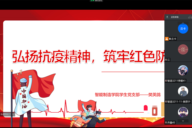 在疫情防控“停课不停学、停课不停教”的特殊时期,1月7日,智能制造学院第一、二、三学生党支部以把疫情当教材开展“弘扬抗疫精神,筑牢红色防线”主题云党课。第一学生党支部书记樊英鸽主持会议,全体预备党员参加会议。