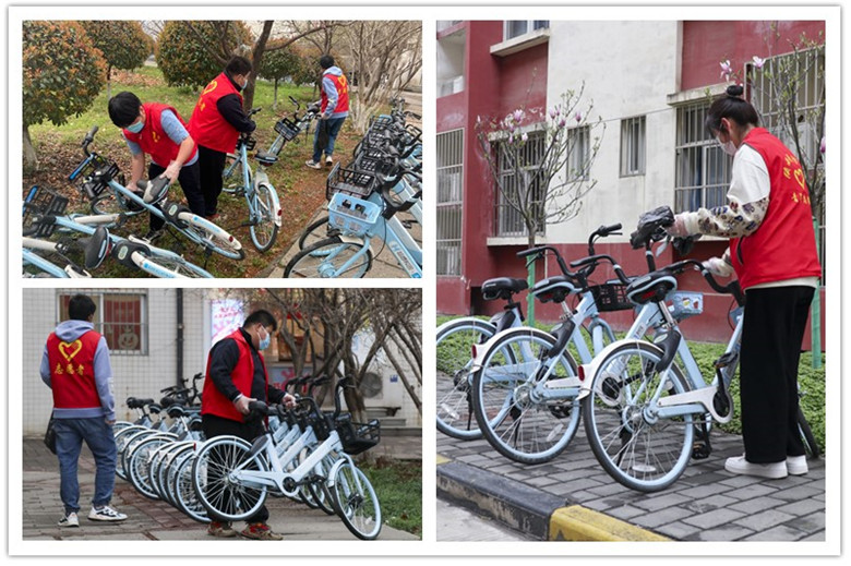 志愿者们对学校图书馆楼下,宿舍、食堂、浴室门口及校内道路上的共享单车进行整理。他们积极主动,分工明确,有的用抹布擦拭单车上的泥土,有的将单车篮子里的垃圾放进垃圾袋里,还有的将乱停放的共享单车扶正,统一摆放在共享单车推荐停车点。经过志愿者们的共同努力,校内共享单车陆续回归原位,一排排的整洁干净的单车成为校园一道亮丽的风景线。