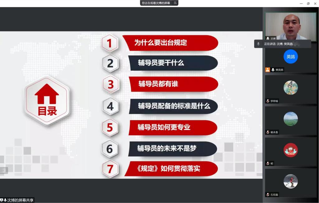 会上,沈博带领大家学习了《普通高等学校辅导员队伍建设规定》,从为什么要出台规定,辅导员要干什么,辅导员都有谁,辅导员配备得标准,辅导员如何更专业,辅导员的未来不是梦,《规定》如何贯彻落实七个方面进行解读。他提出所有专兼职辅导员要深刻理解《规定》出台的背景和重要意义,要准确把握《规定》主要内容,把《规定》作为提高自身专业水平和职业能力的行为准则,敬业爱生,潜心育人,切实提高工作能力和工作水平。