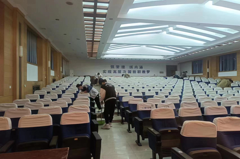 为了强化学生健康理念,提高自我防护和改善环境的意识,践行爱国卫生运动精神,基础课部组织志愿者打扫南校区报告厅,做到物品摆放整齐、环境干净清新,以亲身劳动将文明卫生教育与热爱祖国、热爱校园、热爱生活相结合,引导广大学生学习雷锋精神,为同学服务。