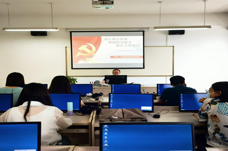 【外语教师党支部】5月18日下午,外语教师党支部书记杨文革在北区教5-607为支部全体党员上主题教育专题党课。外语教师党支部全体党员参加此次党课学习。杨文革就近期参加学习贯彻习近平新时代中国特色社会主义思想读书班,学习《习近平新时代中国特色社会主义思想专题摘编》、《习近平新时代中国特色社会主义思想的世界观和方法论专题摘编》、《习近平关于调查研究论述摘编》、《论党的自我革命》等,为大家谈了自己的心得体会。主要从四个方面,一是坚持以学铸魂,进一步提高政治站位,二是坚持以学正风,进一步锤炼政治品格,三是坚持实践导向,知行合一,四是坚持需求导向,联系工作实际,守正创新。强调主题教育的目的还是党员同志通过学习,深刻理解和全面把握习近平新时代中国特色社会主义思想丰富内涵和精神实质,全面贯彻党的教育方针,落实立德树人根本任务。杨文革强调,我们学习习近平新时代中国特色社会主义思想,就是要以学正风、以学促干。按照“学思想、强党性、重实践、建新功”的总要求,党员同志要立足本职工作岗位,发挥模范带头作用,结合自身工作实际,开拓创新,紧紧围绕学院核心指标开展各项工作,一线教师要始终坚持做好课堂教学工作,坚持课堂教学核心地位,并不断提高自身业务能力。管理岗位党员要坚持管理就是服务的理念,提高工作效率,保质保量完成岗位工作。