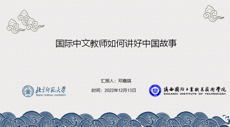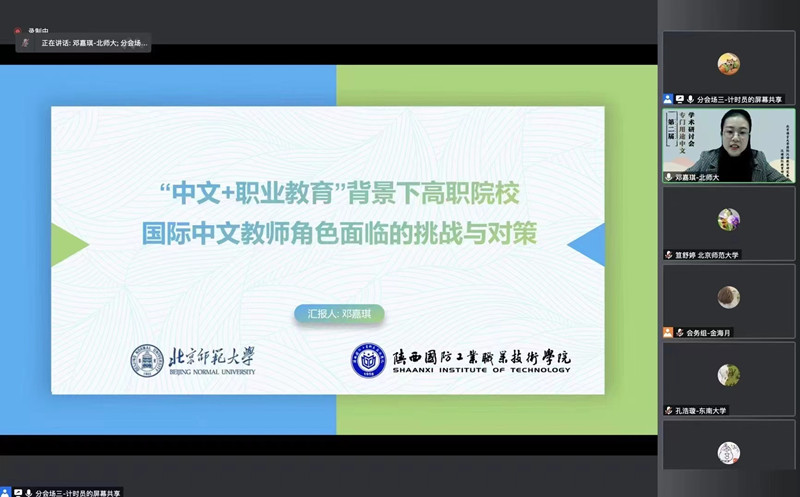 为助力国际中文教育多元发展,提升来华留学生汉语水平,促进职业技能与国际中文教育融合发展。2022年11月26日、12月10日、12月13日,由北京语言大学主办的第二届专门用途中文学术研讨会、北京语言大学主办的第四届来华留学生高峰论坛以及浙江师范大学主办的首届国际中文教育专业博士生论坛顺利举办,我校邓嘉琪老师受邀参加并作主题报告。