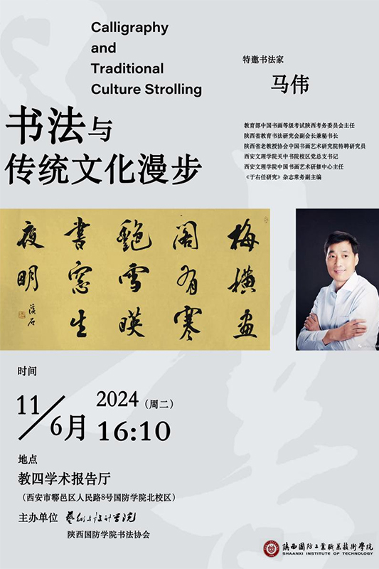 本次活动邀请教育部中国书画等级考试陕西省考务委员会办公室主任、陕西省教育书法研究会副秘书长、陕西慈善书画研究会研究员、著名书法家马伟教授作题为《书法与传统文化漫步》的专题讲座。