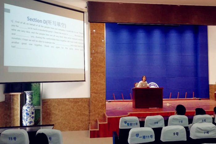 为帮助我校学生有效应对英语应用能力AB级考试,6月11日下午4点40分,由基础课部举办的英语AB级考试讲座分别在南北区报告厅同时进行。南区由王莉老师主讲, 北区由杨青老师主讲,数百名学生参加了此次讲座,整个讲座过程中,同学们聚精会神,专心致志,边听边记。