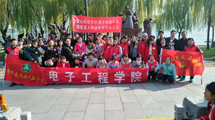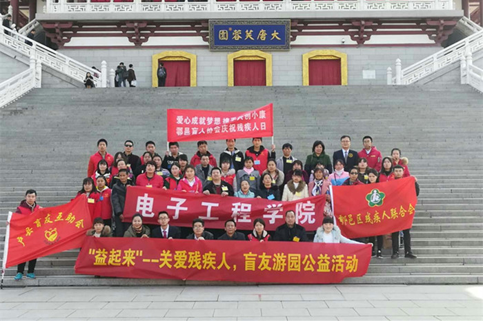 初冬的太阳暖烘烘的照在大地上。2017年12月3日在西安市大唐芙蓉园由电子工程学院与院团委联合组织志愿者帮扶活动。本次活动的主题是“爱心成就梦想,携手共创小康”。本次活动帮扶的对象是户县盲协和盲友互助会的盲人朋友。活动以关爱盲人生活,倾听盲人世界,通过活动让更多的人了解盲人生活不易,唤起人们的爱心。在与盲人的接触中过程中同学们学习盲人自强不息,乐观进取的精神,携手共创小康生活。