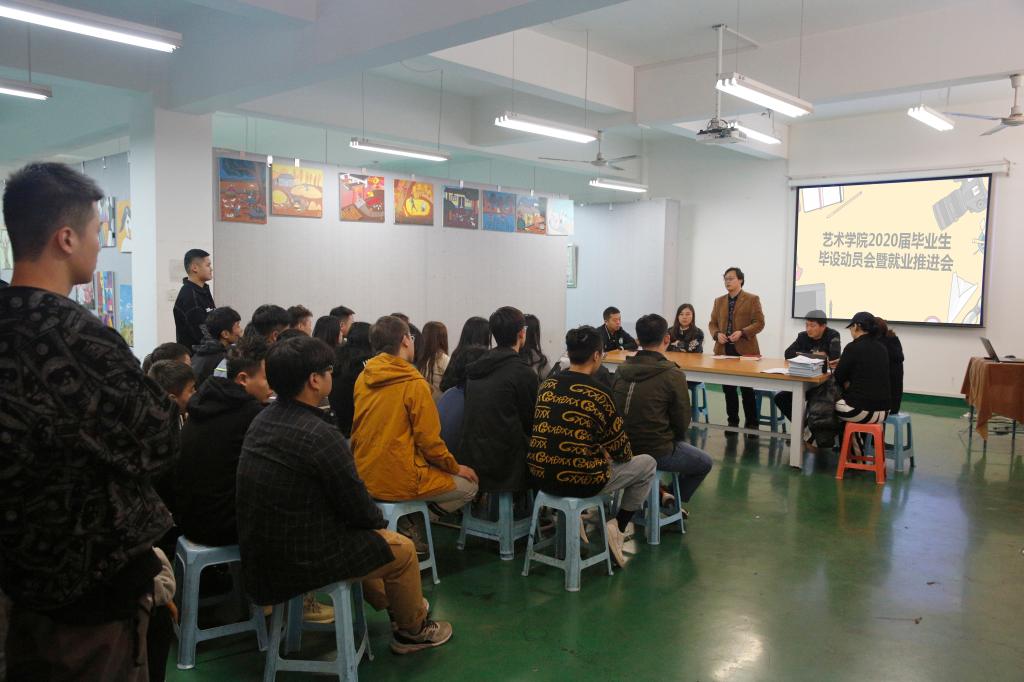 2019年10月29日下4点,艺术学院2020届毕业生毕设动员会暨就业推进大会在艺术学院第一画室(13-308)召开。艺术学院院长惠晓钟、副院长管阳、艺术教研室主任房强、毕业设计指导老师、毕业班辅导员以及2020届全体毕业生参加此次会议。会议由艺术教研室主任房强主持。