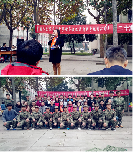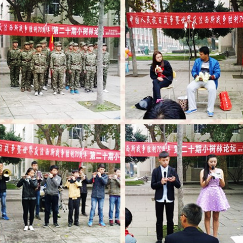 今年是中国抗日战争暨世界反法西斯战争胜利70周年纪念,11月4日,建热学院在南校区小树林举办了“中国抗日战争暨世界反法西斯战争胜利70周年纪念”第二十期小树林论坛活动,参加这次活动的有学院原党委副书记陈黛琴老师,建热学院党总支书记张向阳老师,建热学院二十名专兼职辅导员以及大二270名学生代表。
