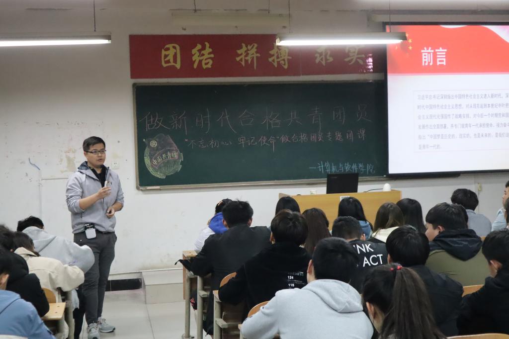 11月11日晚,计算机与软件学院团总支开展“不忘初心 牢记使命”做合格团员专题团课,各团支部书记、组织委员等116名团员代表参加团课学习,专题团课由计算机与软件学院团总支书记周睿主讲。