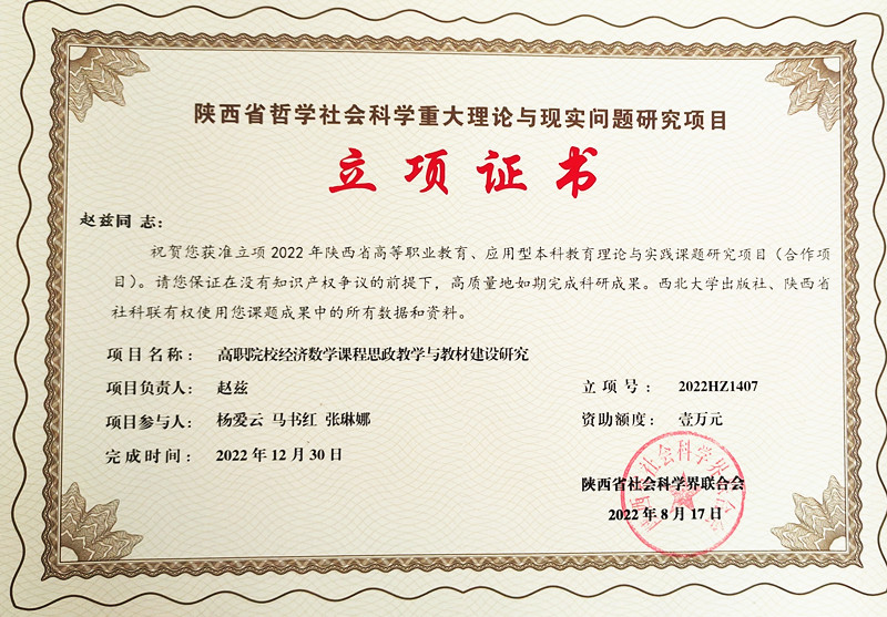 近日,陕西省社会科学界联合会发布《关于公布2022年度国家传播能力建设重点研究项目立项结果的通知》(陕社科联〔2022〕65号)和《关于公布2022年陕西省高等职业教育、应用型本科教育理论与实践课题研究项目立项结果的通知》(陕社科联〔2022〕94号)。基础课部教师杨文革老师申报的《基于VETS实训平台探索1+X书证融通模式研究》课题、杨季行老师申请的《高等职业教育“课程思政”教学研究》课题和赵兹老师申请的《高等院校经济数学课程思政教学与教材建设研究》课题获批立项。