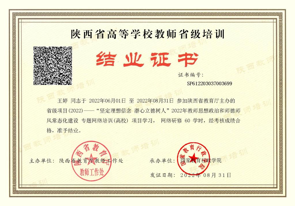 近日,基础组织以学校2022年度基层党建创新项目《后疫情时代师德师风建设中如何发挥教师党支部的战斗堡垒作用》项目组成员为核心的10位教师参加“坚定理想信念 潜心立德树人——2022年教师思想政治和师德师风常态化建设”专题网络培训项目学习。本次培训由陕西省教育厅和国家教育行政学院主办。