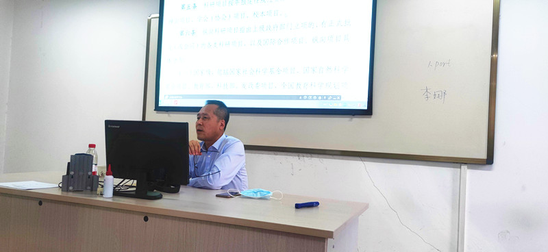 高葛教授首先认真解读了我校发布的各项科研管理文件,对横向课题做了明确的界定,介绍了我校横向课题的申报流程以及获取途径,对课部教师申报横向课题有一定的指导作用。高葛也详细介绍我校科研课题申报情况、科研课题申报注意事项、如何做好课题研究工作等方面详尽而生动地进行了阐述。他号召全体教师要注重科研成果的转化并高度注意维护自身的科研诚信建设。