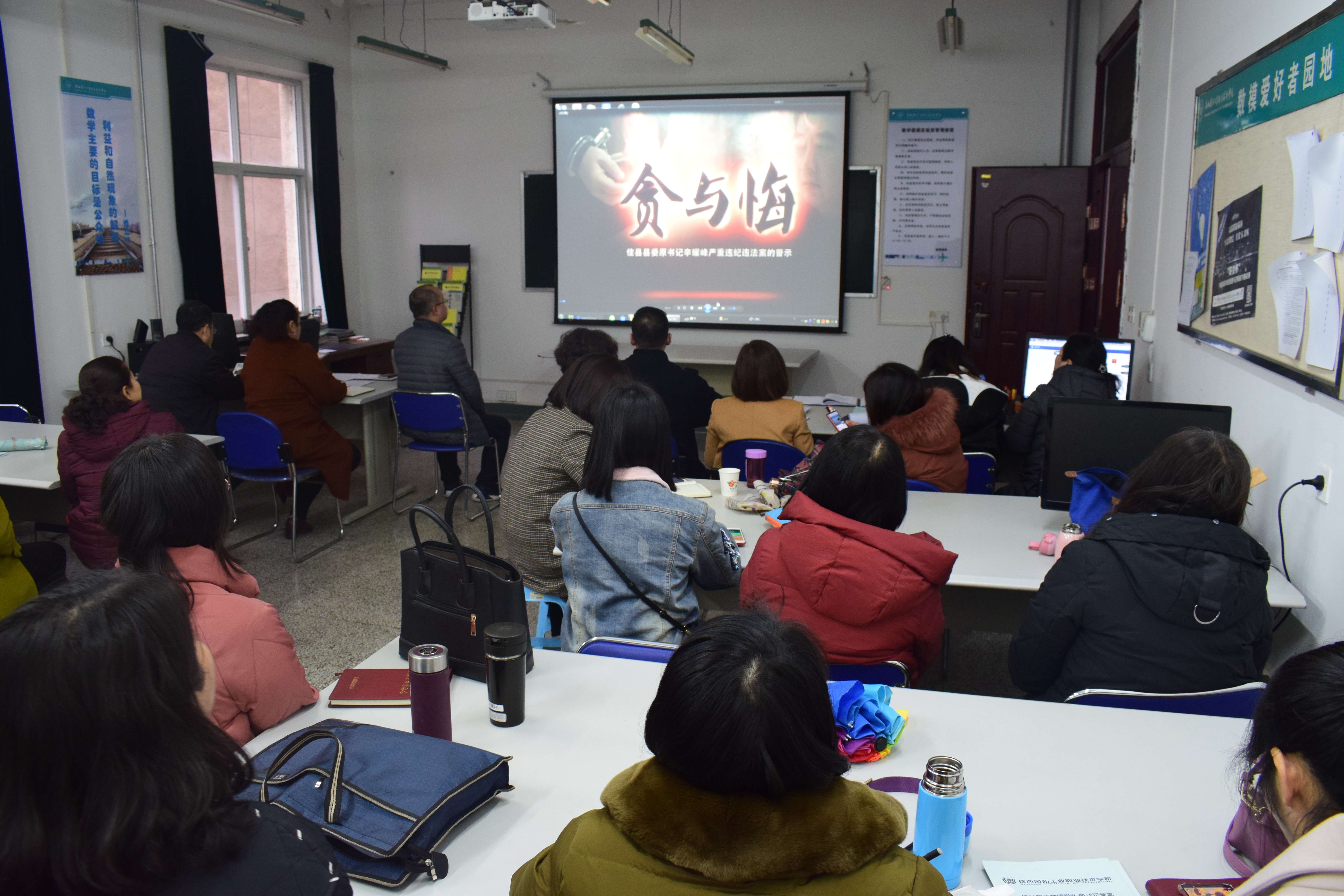 会中全体教职工观看了《贪与悔》和《讲政治敢担当改作风》专题教育警示片,总支书记吴玮玮带领大家学习了陕教工【2019】4号文件《关于高校违反中央八项规定精神和师德师风问题典型案例的通报》。