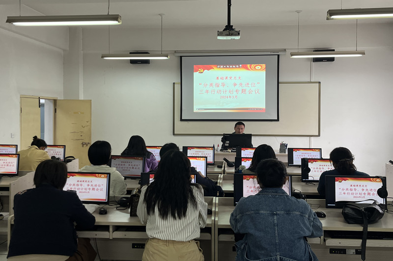 根据校党委《全校基层党组织“分类指导、争先进位”三年行动计划工作实施方案》文件要求,基础课党总支于2024年3月21日召开专题会议,会议有党总支书记权华主持,基础课部全体教职工、党员参会。