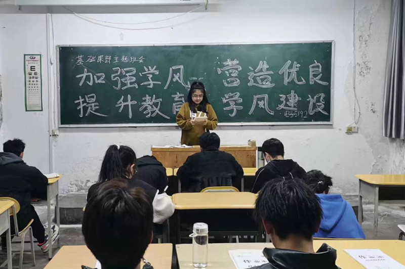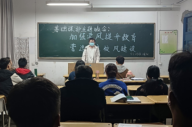 根据党委必威app安卓版无弹窗部2022年【14】文件《关于开展“加强学风提升教育 营造优良校风建设”主题班会的通知》相关要求,为进一步规范和提升基础的教育教学水平,在学生中形成争先创优的浓郁学风,以“厚德重能,励学敦行”的校训和“勤奋、严谨、求实、创新”的校风为抓手,积极践行“忠博武毅”的国防职教精神。基础课部于2022年11月8日晚组织9个班级以“加强学风提升教育营造优良校风建设”为主题开展主题班会。