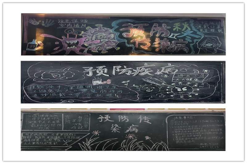 传染病预防宣传主题板报。为有效预防和控制传染性疾病在校园的发生和蔓延,增强师生的防病意识,确保师生的身体健康。基础课部坚持“多宣传、重预防”等原则,利用班级黑板报作为宣传阵地积极开展秋冬季传染病预防。