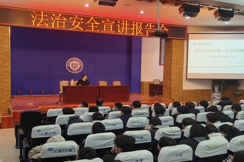 为进一步提高广大师生的法治意识,切实增强大学生安全防范能力,助力平安校园建设,2023年12月11日下午基础课部在南校区报告厅举办法治安全宣讲报告会,特邀请西安市公安局鄠邑分局余下派出所赵文博警官和中国邮政储蓄银行鄠邑区余下支行石维维行长为基础学生开展法治安全讲座。