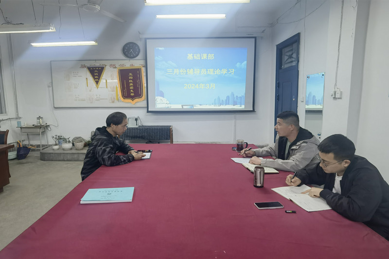 根据陕国职学工字〔2024〕13号文件《关于开展三月份辅导员理论学习的通知》相关要求,为加强基础辅导员队伍建设,进一步提升辅导员的理论水平、业务能力和岗位任职能力,构建辅导员长效学习机制,基础课部于2024年3月31日晚在南校区教1-313办公室组织开展三月辅导员理论学习,会议有学生科长余腾飞主持,全体辅导员参加学习。