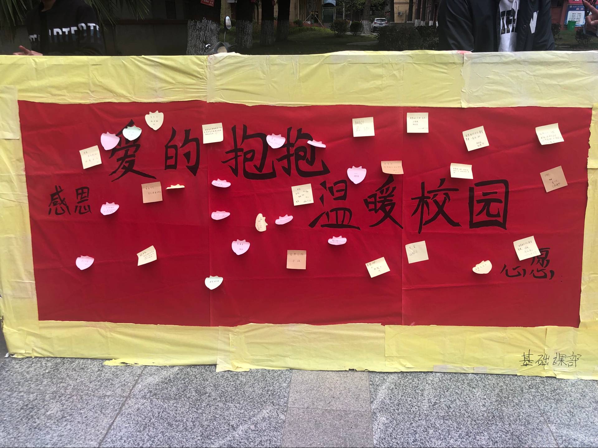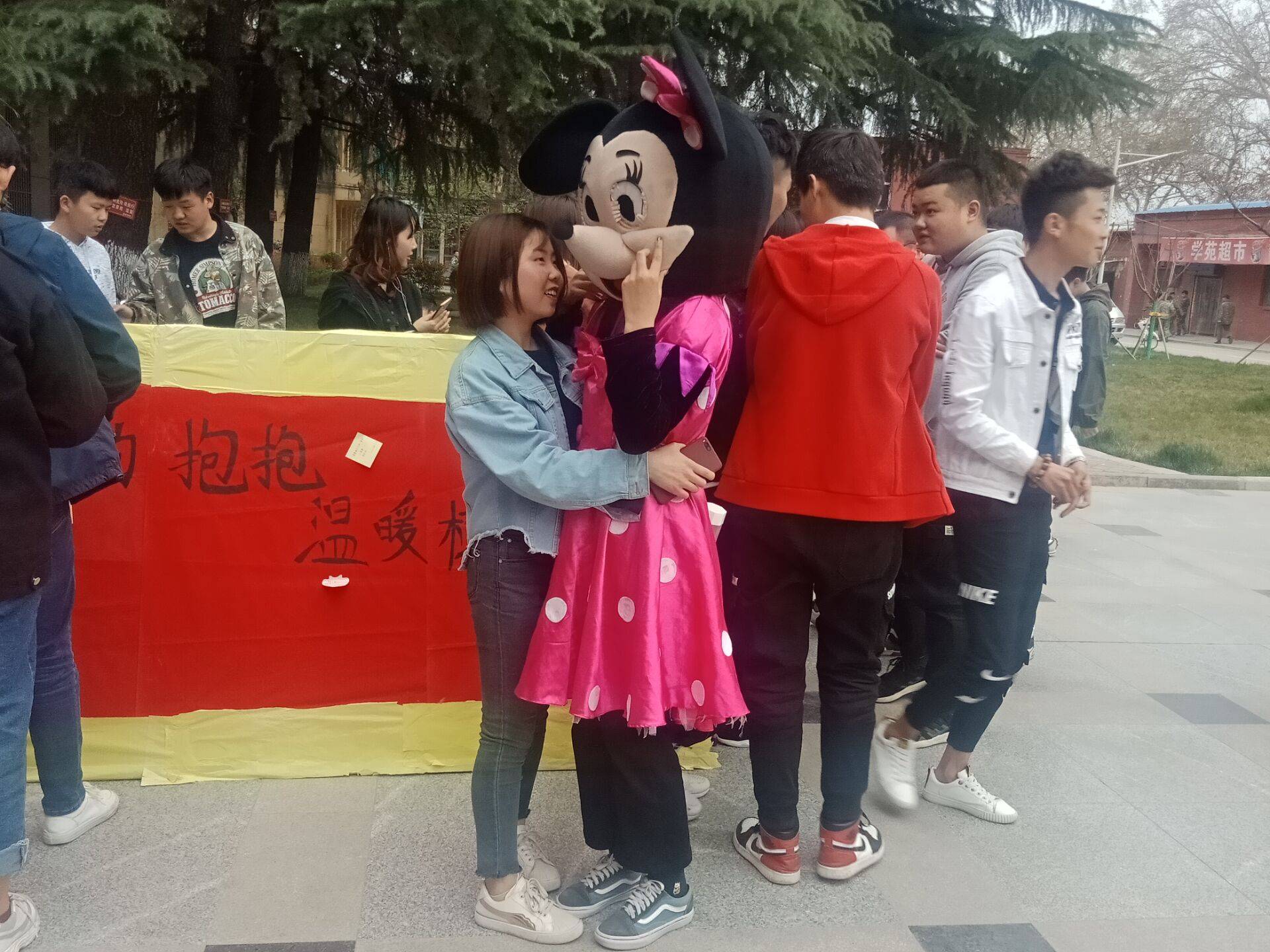 肢体语言比语言更有力量,而拥抱是最柔软、最有力量的方式,拥抱对治疗疾病,疾病,孤独,抑郁,焦虑和压力非常有效。为缓解大学生的精神压力,培养大学生敞开心扉,友善交往的积极心态,远离虚拟游戏世界,培养主动与人交往的意识。2019年3月27日下午16:30,基础课部由心理部主办的“爱的抱抱,温暖校园”活动在一号教学楼前举办。