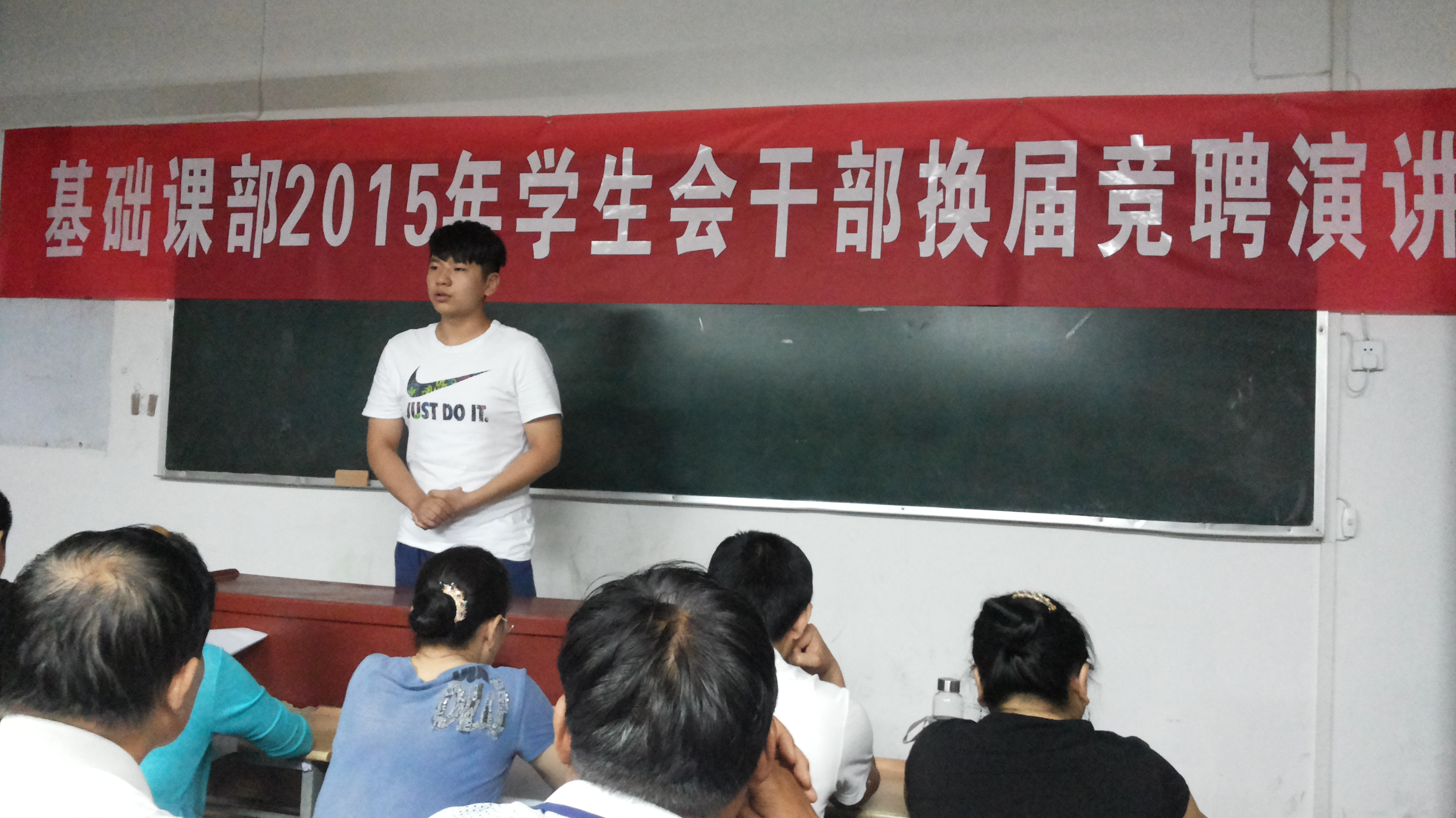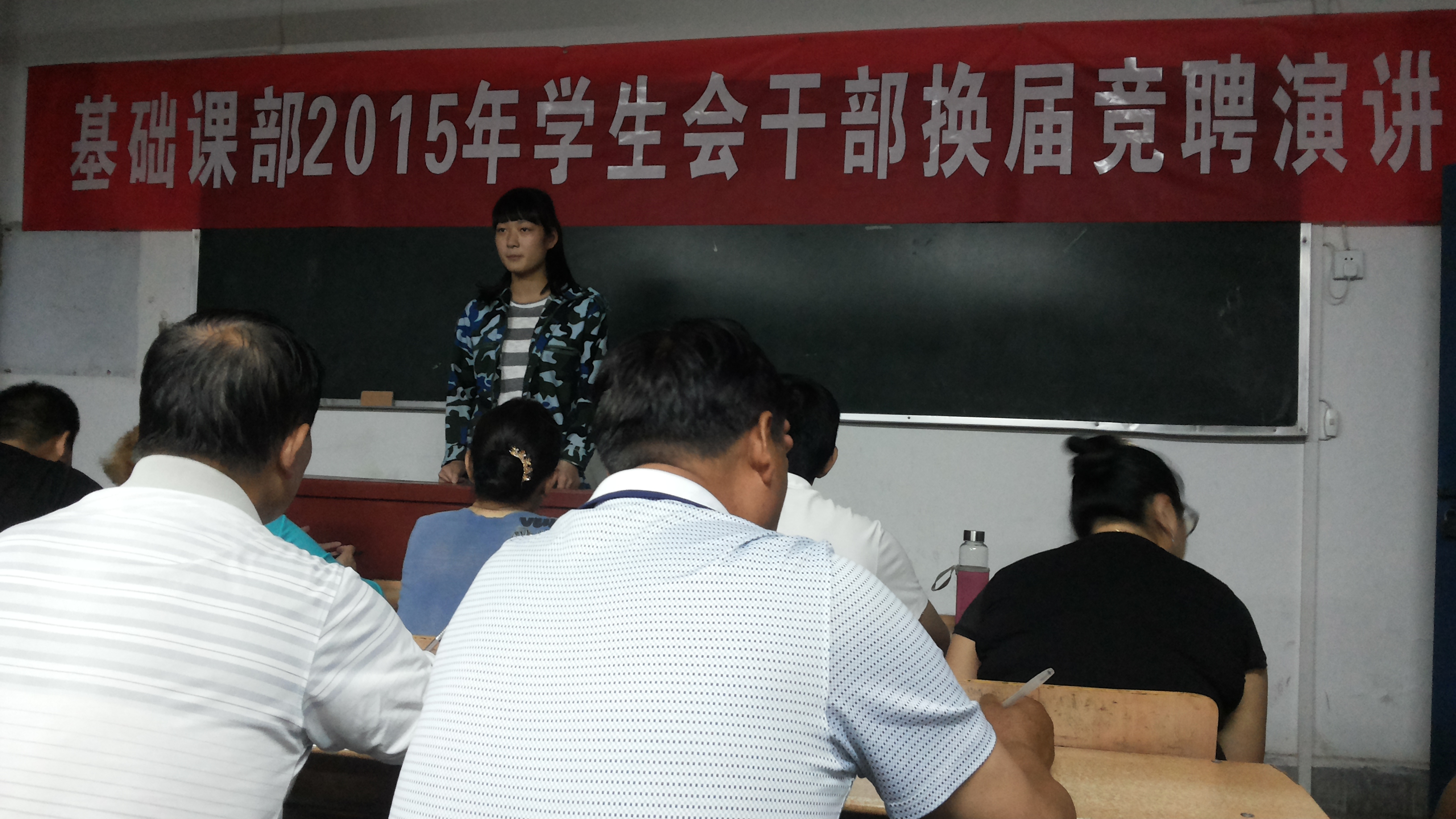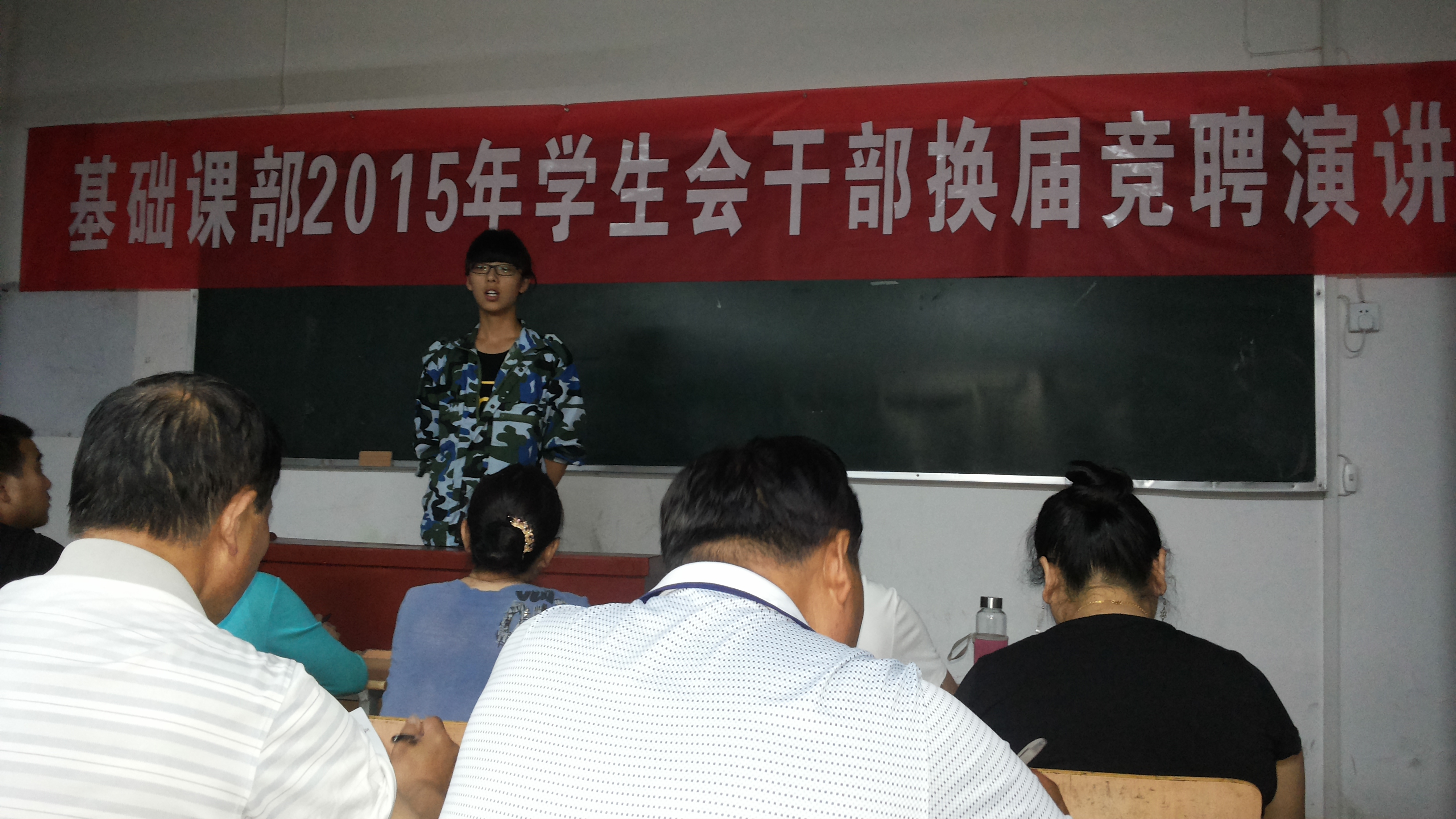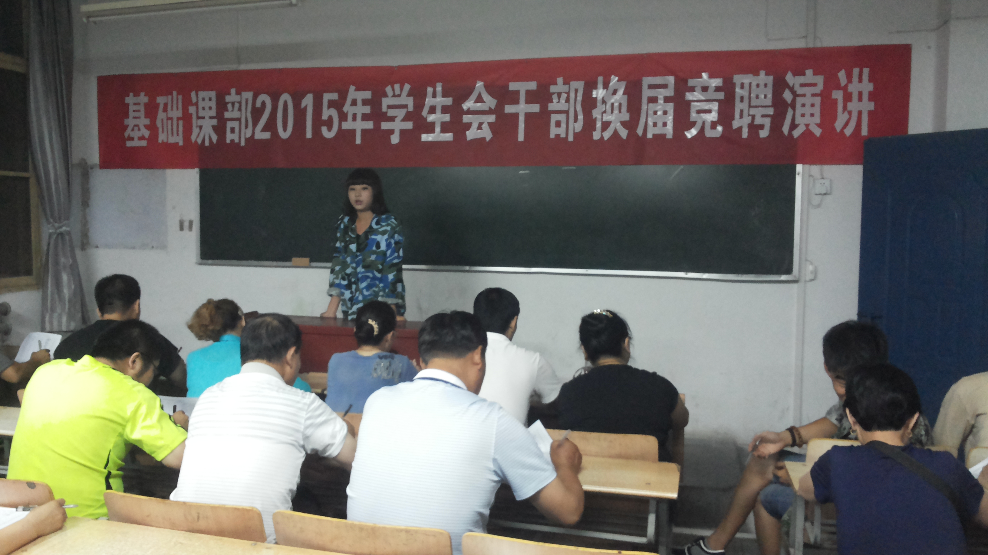 2015年6月17日晚上,经过长期的准备,基础课部必威app安卓版无弹窗办公室组织了第五届学生会干部换届工作大会,会议由刘娟老师主持。基础课总支书记杨文革老师对竞聘学生做了鼓励动员讲话并提出要求。教官和辅导员担任评委,所有第四届学生会部长和主席、团总支副书记参与。评委对每位竞聘者进行打分,参考各部门部长和教官的推荐,最终确认了基础课部第五届学生会干部成员。