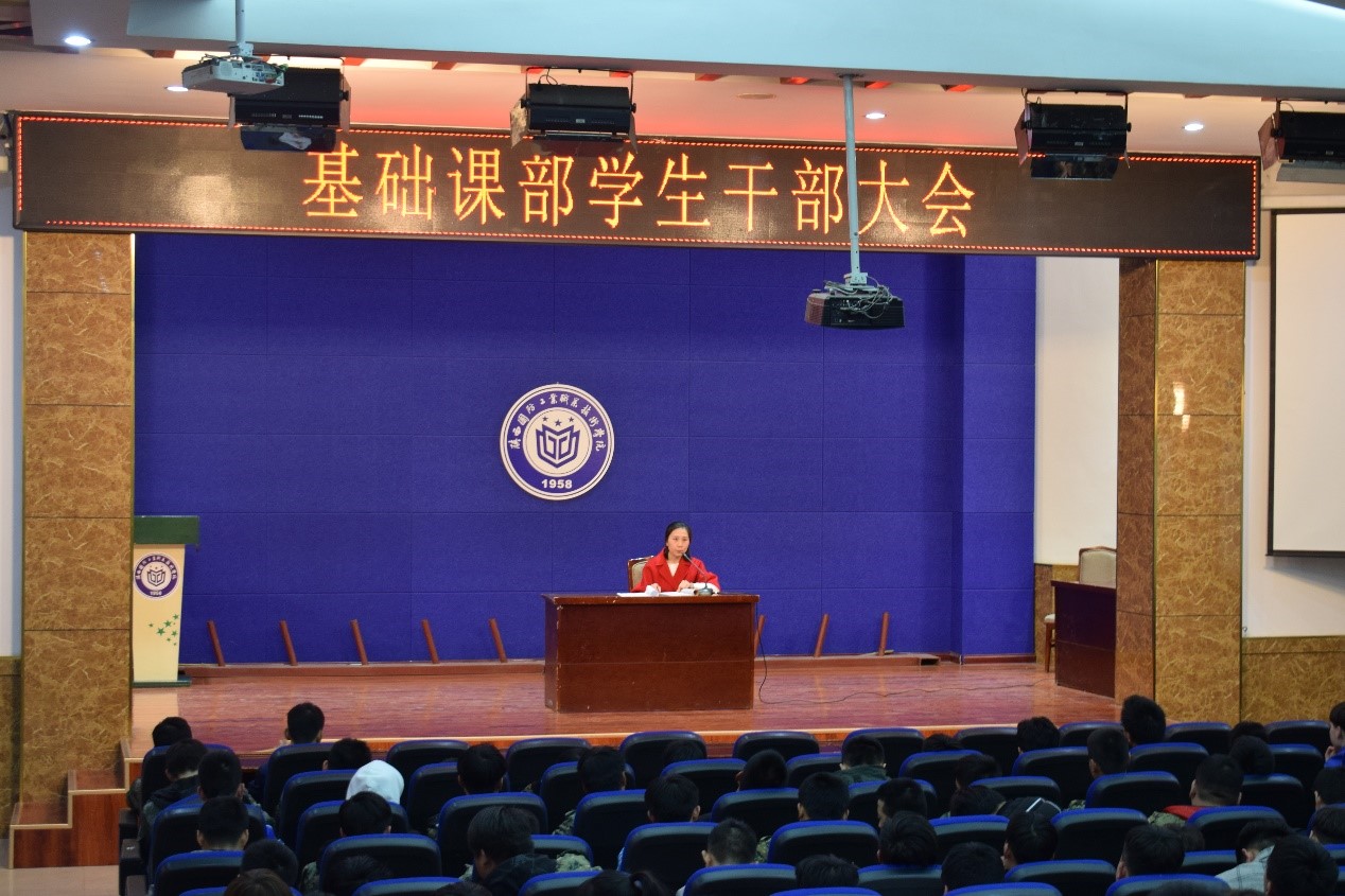 新学期伊始,为进一步加强学生干部队伍建设,充分发挥学生干部在学校管理和校园文化建设中的作用,基础课部于2019年3月11日19:30在南区报告厅召开全体学生干部大会,基础课部全体学生会干部,各班班干部以及宿舍长共计300余人参加了此次大会,会议由基础课部辅导员段聪影老师主持。