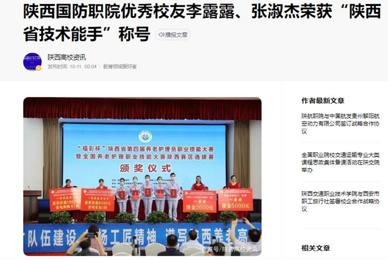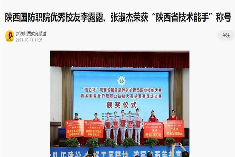 我院老年服务与管理(现更名为智慧健康养老服务与管理)专业优秀毕业生李露露、张淑杰在9月29日举办的陕西省第四届养老护理职业技能竞赛暨全国养老护理员职业技能大赛陕西赛区选拔赛中获得个人一等奖,并被授予“陕西省技术能手”称号,她两的先进事迹先后被学校官网、陕西高校资讯、新浪陕西教育频道等多家媒体转载报道。