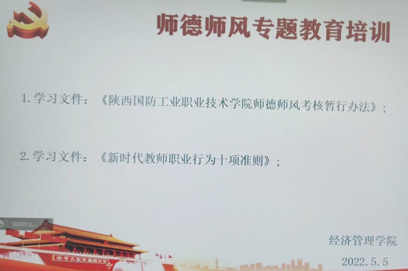 5月5日下午,经济管理学院通过腾讯会议线上组织开展师德师风专题教育培训会。全体教职工参加了本次学习,会议由教学科长徐松主持。