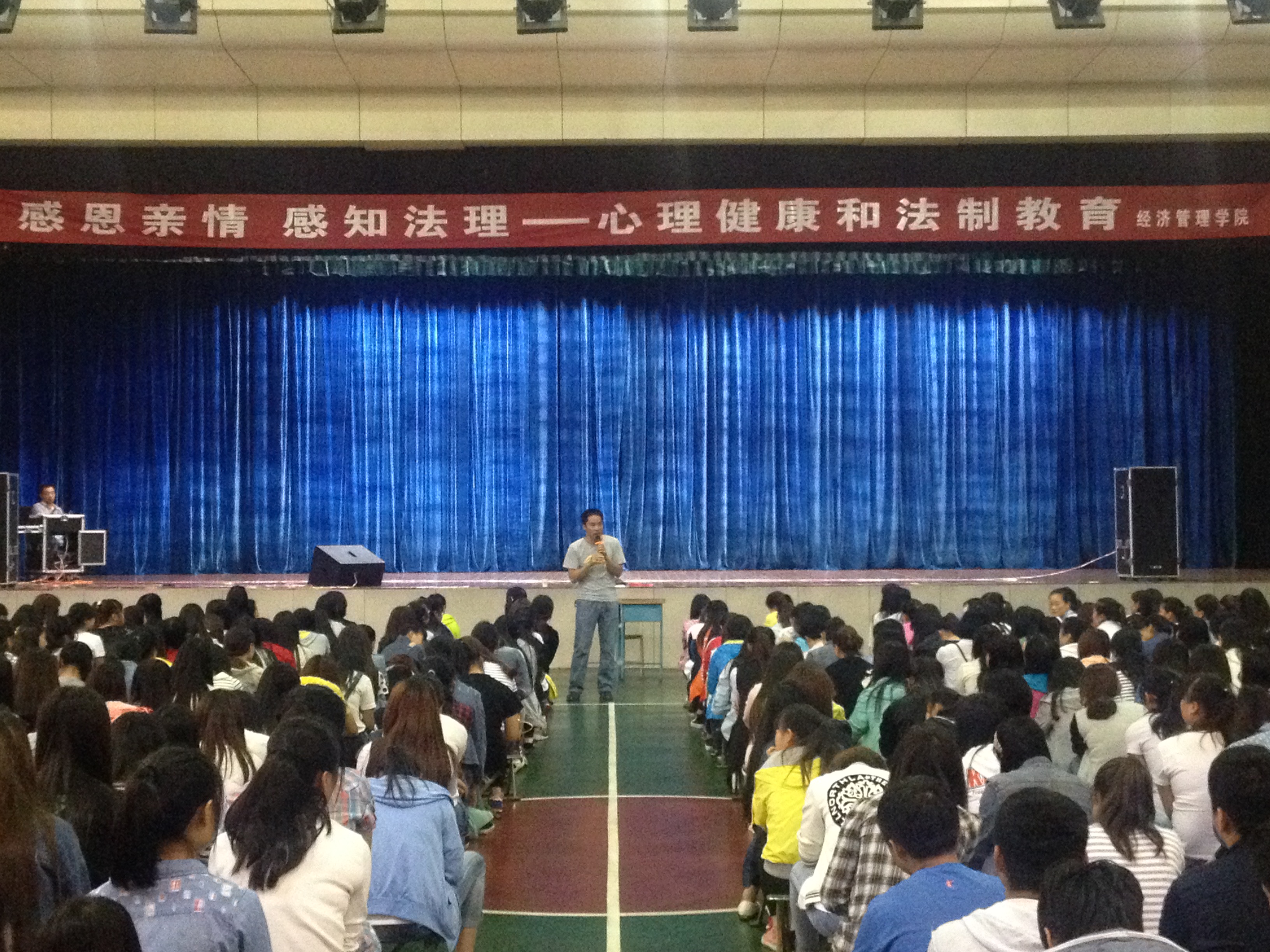 2015年 6 月 3 日下午经济管理学院以“感恩亲情、感知法理——心理健康和法制教育”为主题的心理指导讲座在我校大学生活动中心隆重举行;我分院特别组织了全分院的学生听取了讲座。 主讲人胡老师,著名的心理咨询师、 家庭医疗师、 催眠医疗师。 本次讲座精彩与生动,掌声不断。透过呼吸观想的练习、透过动态静心的练习,在安全而敞开的环境里唤醒身体的记忆,释放那些沉睡依旧的负性能量和负性情绪,让它们在行动中转化成正向能量再度流动,目的使同学们找到自由的喜悦和爱,在这个过程中体验到心灵和生命自由的整合重生。此次讲座,胡老师主要探讨的是人该怎样有一个正确的情感观和人生观。其丰富的心理学知识和对人心理的独到见解使同学们开拓了自己的知识面并从中受到很大 启发。 讲座过后,胡老师现场和同学们互动,并与同学们进行心理互动小游戏, 使同学们在娱乐中增加了对心理学知识的兴趣。