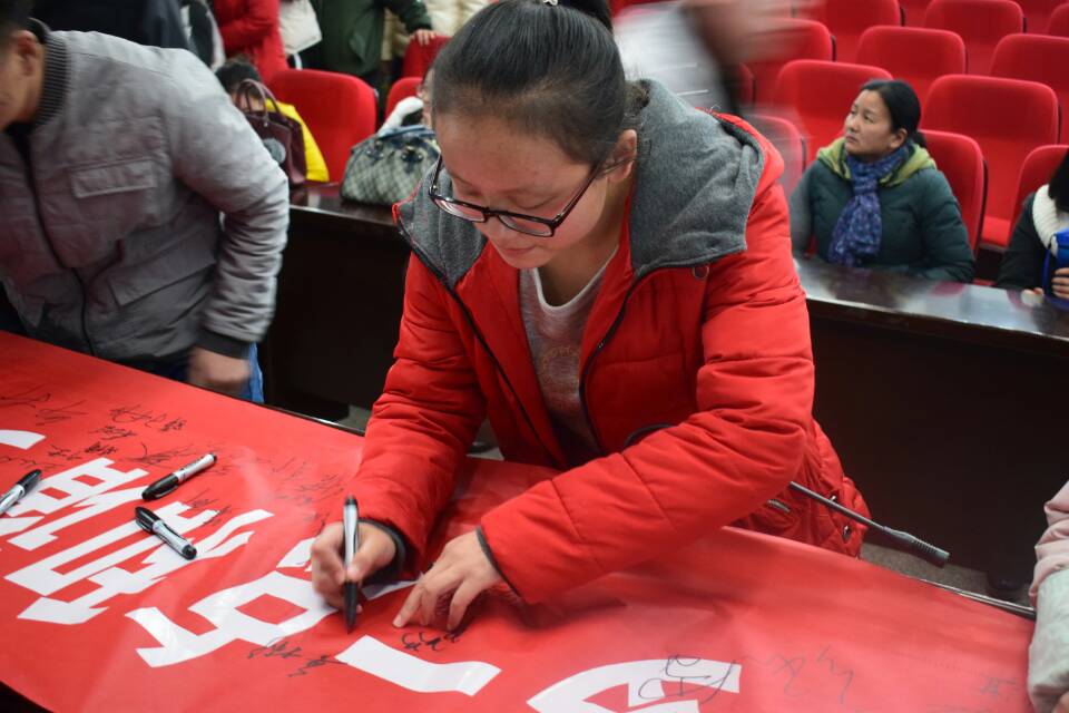 会议第一项,闫应召老师宣读“安全文明宿舍”评比月活动通知、“安全文明宿舍”考核评比细则以及经济管理学院教室考核标准;第二项,学生代表田坤同学表态发;第三项,观看宿舍安全视频以及使用违规电器的危害;第四项,横幅上作表态签名。