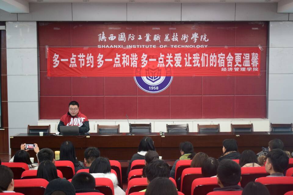 经济管理学院于2017年11月27日下午4点30在教2报告厅召开“安全文明宿舍”评比月活动动员大会,会议由闫应召老师主持、我院全体辅导员老师及大一大二年级各班班干部、宿舍舍长等参加了动员大会。本次活动的主题是:多一点节约,多一点和谐,多一点关爱,让我们的宿舍更温馨。