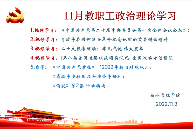11月3日下午,经济管理学院党总支利用线上+线下的形式开展11月份政治理论学习,全体教职工参加了本次学习,会议由党总支书记王文雅主持。