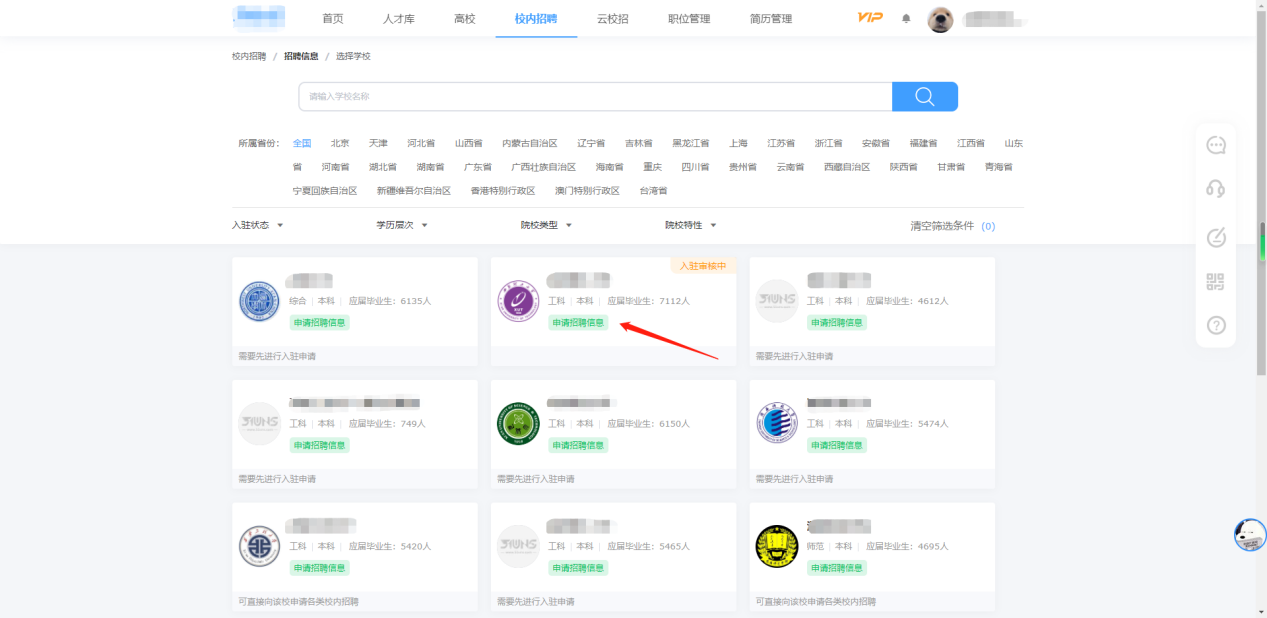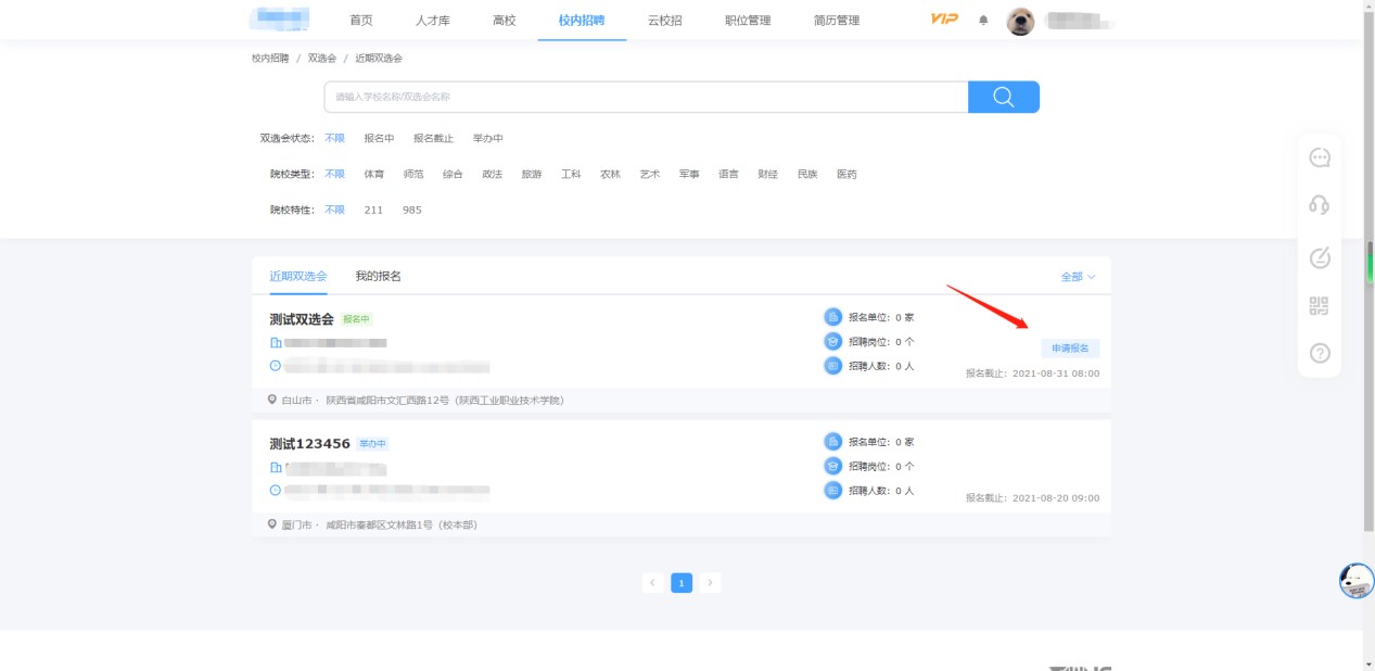 (四)完成在线报名后,可点击顶部导航栏的“校内招聘”-“双选会”,点击“我的报名”,再点击“查看进度”来查询学校审核进度。