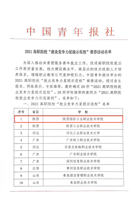 近日,由中国青年报社主办的“2021高职院校就业竞争力星级示范校”评选活动结果公布。我校以排名第一获评“2021高职院校就业竞争力星级示范校”荣誉称号。