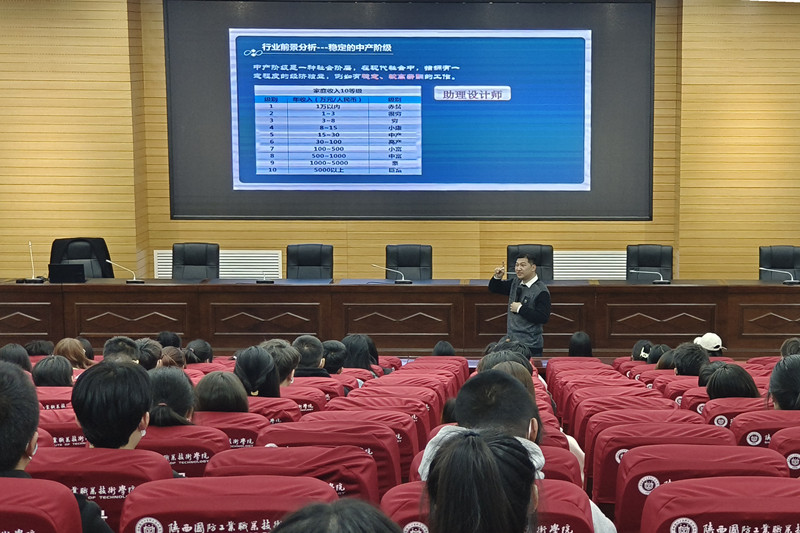 2023年3月14日晚19:30,艺术与设计学院特邀请北京佳玥科技有限责任公司CEO孙浩在北区教四报告厅作了题为《设计专业行业发展与就业前景》专题报告会。艺术与设计学院党总支书记常继红、学生科长高翔及室内艺术设计专业、环境艺术设计专业全体学生参加。报告会由高翔主持。