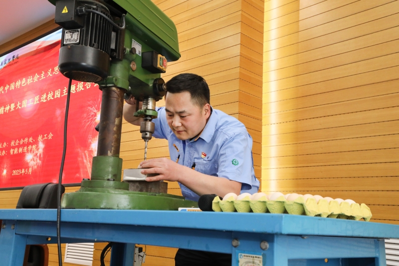 随后,张新停“以兵工赤子之心,立报国一技之长”为主题,从“二十大历程见闻、党代表通道、党的二十大精神”三个方面,结合自己的工作实际,解读了二十大报告的丰富内涵和精神实质,用“安心、贴心、信心、匠心”四心阐述了自己的心得体会。之后张新停在现场为大家展示了自己绝技绝活——鸡蛋壳打孔。他鼓励广大师生,立足岗位,精益求精,以身作则弘扬劳模精神、劳动精神、工匠精神,坚守初心,提升创心,争取早日成为行业精英、业界翘楚,寄望更多的青年人走技能成才、技能强国之路。
