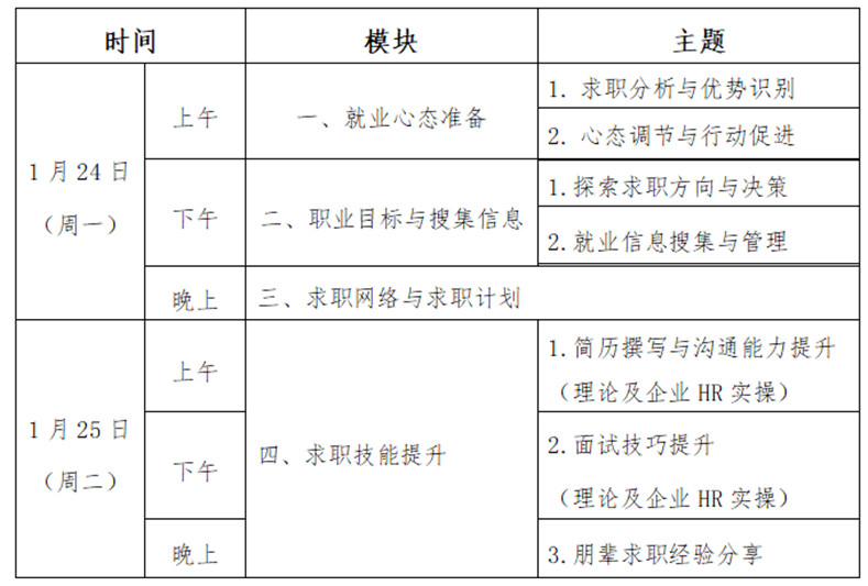为落实教育部《教育部办公厅关于实施宏志助航计划——全国低收入家庭高校毕业生就业帮扶项目的通知》精神以及陕西省教育厅有关要求,结合西安市疫情防控形势,西安交通大学将于1月24日-25日开展“宏志助航计划”就业能力线上培训,具体事宜如下: