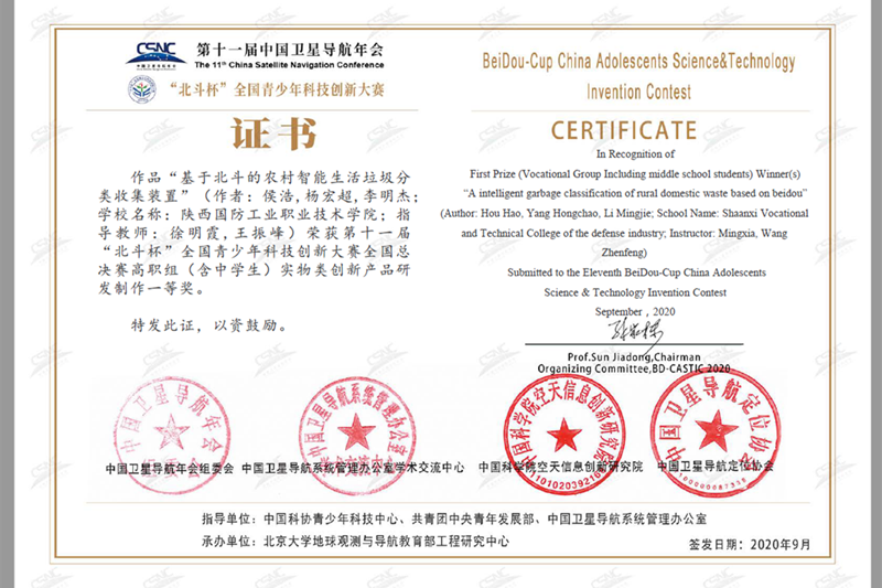 2020年11月22——25日,第十一届中国卫星导航年会(CSNC2020)在成都举办。我校参赛作品经过书面评审、线上答辩等环节,与来自国防科技大学、中国人民解放军战略支援部队信息工程大学、北京理工大学、东南大学、哈尔滨工业大学、吉林大学、中国矿业大学等97个参赛团队、500余名师生一起经过激烈角逐,由我校建筑与热能工程学院教师徐明霞、王振峰指导学生侯浩、杨宏超、李明杰组队的参赛作品——《基于北斗的农村智能生活垃圾分类装置》,荣获全国总决赛北斗科技实物类一等奖(高职组唯一获奖);徐明霞老师荣获第十一届“北斗杯”全国青少年科技创新大赛全国总决赛十佳优秀科技教师奖(高职院校唯一入选);我校荣获第十一届“北斗杯”全国青少年科技创新大赛西北赛区优秀组织奖(高职组唯一获奖)。