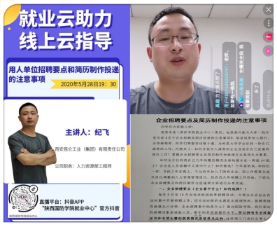 为促进我校毕业生积极应对就业,正确把握就业方向,5月28日,就业中心联合建热学院在抖音平台上进行了就业指导在线直播,邀请西安昆仑工业(集团)有限责任公司人力资源部工程师纪飞为我校师生作了题为“用人单位招聘要点和简历制作投递的注意事项”的在线直播。学校2020届毕业生和2021届毕业生观看了直播。
