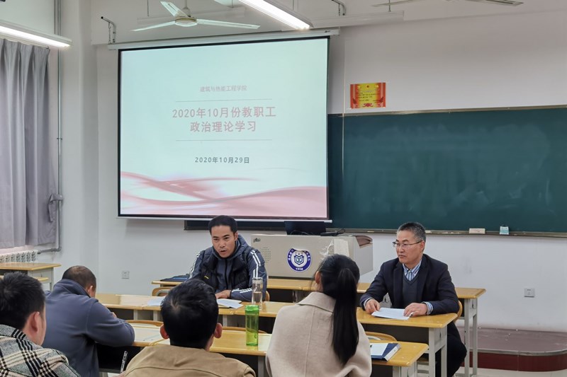 按照陕国职党宣〔2020〕8号文件《关于2020年10月份组织活动暨教职工政治理论学习安排的通知》要求,建筑与热能工程学院于2020年10月29日下午在教4-340召开了本月教职工政治理论学习会议,会议由党总支书记强卫印主持,全体教职工参加会议。