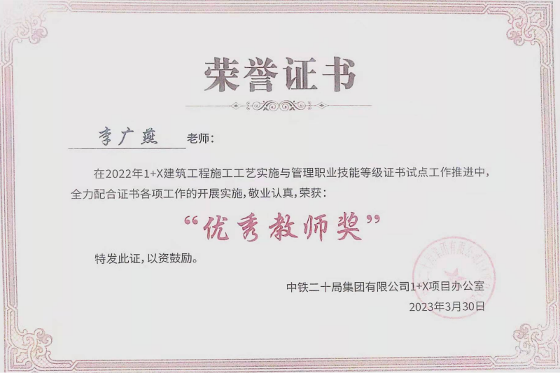 在本次会议上对1+X建筑工程施工工艺实施与管理职业技能等级证书2022年度优秀单位及个人进行了表彰,我校建筑工程学院李广燕老师代表学院参加了本次表彰会议。我校荣获1+X建筑工程施工工艺实施与管理职业技能等级证书优秀考核站点,王振峰、李广燕两位老师荣获优秀教师奖。在2022年度的试点工作推进中,我校建筑工程学院建筑教研室的王振峰、李广燕、徐明霞等老师们在学院领导的大力支持下,认真贯彻1+X证书制度、统筹协调院校资源、积极组织动员学生,与中铁二十局1+X项目办公室同心协力,校企联动,共同推进证书发展。