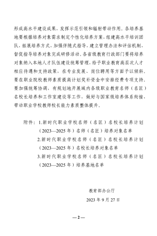 新时代职业学校名师(名匠)名校长培养计划(以下简称职教“三名”计划)从2023年开始实施,计划每年遴选一批中等职业学校校长和高等职业院校(含本科层次和专科层次)从事一线教育教学的在职在岗骨干教师或具有绝招绝技的技能大师,进行为期三年的集中培养。职教“三名”计划注重团队建设、示范引领,要求名师(名匠)名校长培养对象主持建设国家级名师(名匠)工作室和名校长工作室,遴选吸纳工作室成员,在专业发展、岗位聘用等方面予以倾斜,聚焦培养目标和重点任务,加强全周期建设和过程管理,形成高水平建设成果,发挥示范引领和辐射带动作用。