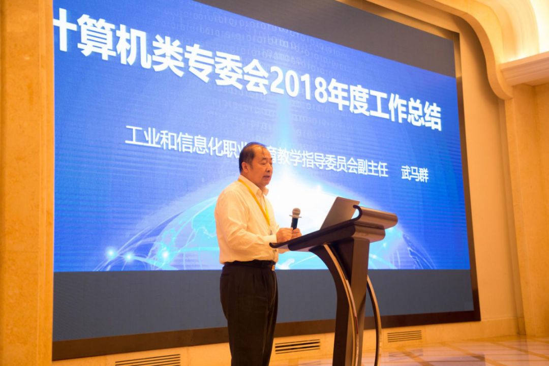 工业和信息化职业教育教学指导委员会副主任武马群做《计算机类专委会2018年度工作总结》,对计算机专指委2018年的工作进行了总结并对2019年工作规划进行了汇报。