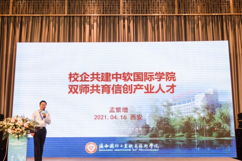 孟繁增副校长代表我校在会上作了题为《校企共建中软国际学院,双师共育信创产业人才》的专题报告。首先介绍了我校根植国防,立足陕西,联合军工企事业单位开展全方位、深层次校企合作,将军民融合贯穿到教育教学改革的全过程,构建了以陕西国防工业职业教育集团为主体,以校企协同发展联盟、现代产业学院、协同创新中心为三翼的“一体三翼”军民融合平台,全面提升学校人才培养、技术技能积累、服务经济社会发展等内涵指标,打造校企合作命运共同体,形成产教融合新生态。