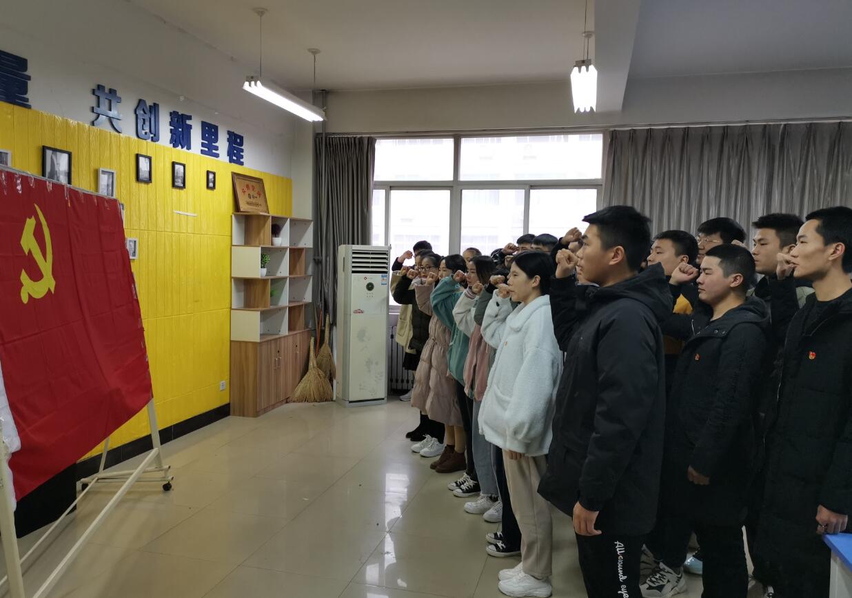 最后,全体党员在学生党支部书记周睿的带领下,面对党旗庄严宣誓,重温入党誓词。党总支书记潘冬向同学们表示祝贺并提出三点希望:一是要铭记入党的初心,坚定新时代中国特色社会主义信念;二是刻苦学习、努力工作、奋发图强、报效祖国;三是要将“不忘初心 、牢记使命”主题教育成果运用到实际的生活工作中去,严格要求自己,甘于奉献,发挥好模范带头作用。
