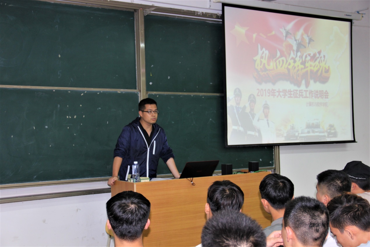 为贯彻落实学校“2019年大学生征兵工作动员部署会议”精神,进一步做好分院2019年学生的征兵工作,帮助学生准确了解征兵相关政策和条件,5月13日,计算机与软件学院召集今年有意愿报名应征入伍的近四十余名学生参加此次大学生征兵工作说明会,说明会由计算机与软件学院学生科科长周睿主讲。