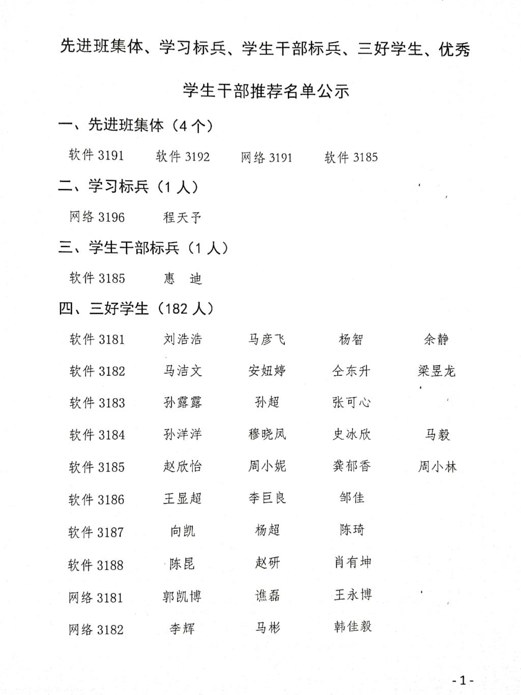 依据《betway必威中文正版“学习标兵”、“学生干部标兵”、“三好学生”、“优秀学生干部”和“先进班集体”评选奖励办法》等相关文件要求,经过学生申请,结合班级推荐及民主评议意见,经研究决定,现将计算机与软件学院2019-2020学年先进班集体、学习标兵、学生干部标兵、三好学生、优秀学生干部推荐名单予以公示。公示时间为2020年9月23日至2020年9月25日。