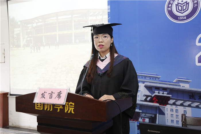 会计2151班周硕同学代表2017届本科毕业生发言,她回忆了在学校的点点滴滴,感谢母校、恩师、挚友,依依不舍的向这段不能忘怀的美好岁月道别。她引用马丁-路德金的话结束她的发言,“I have a dream”我有一个梦,我们所有人都有一个梦!今天开始,我们就要去追逐我们的梦,去追逐怒放的生命。