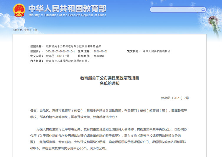 近年来,学校全面落实立德树人根本任务,持续深化课程思政教学改革,深入挖掘各类课程和教学方式中蕴含的思想政治教育元素和承载的德育功能,将价值塑造、知识传授和能力培养三者融为一体。此门课程入选,既体现了我校课程思政建设的新成果,也为我校在课程思政建设理论研究和教学实践,创新课程思政建设方法路径,构建全面覆盖、类型丰富、层次递进、相互支撑的课程思政体系建设道路上提供了宝贵经验。我校将以此为契机,继续建设一批充满思政元素、发挥德育功能的高水平课程思政示范课程,培养一批具有亲和力和影响力的课程思政教学名师,形成一批具有学校特色的课程思政教学成果。